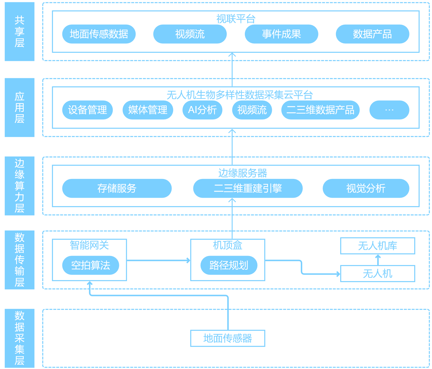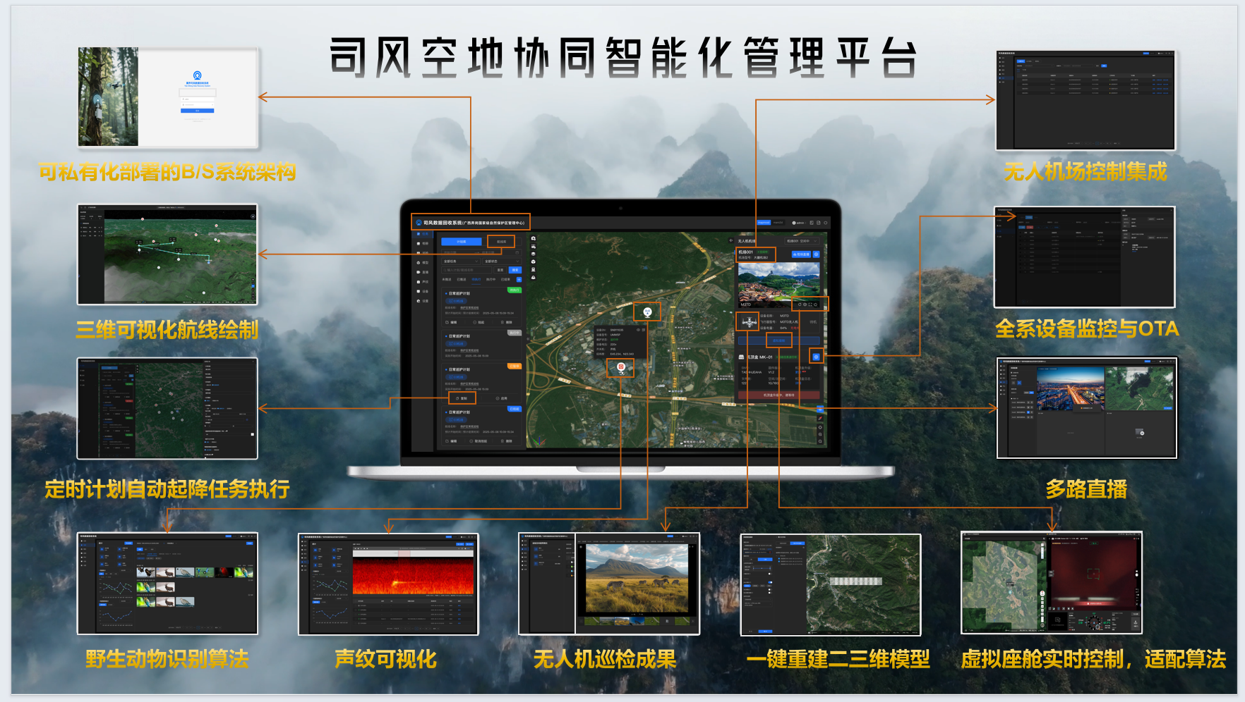 主要功能有模型、直播、声纹、设备管理、媒体管理、物种识别等功能。该系统集成无人机控制管理系统,可对无人机机场及其无人机下发巡检任务,通过巡检任务触发无人机自动执行航线规划,调用机顶盒唤醒并连接微基站,实现数据回传,最终将生物多样性监测数据回传至数据管理系统。