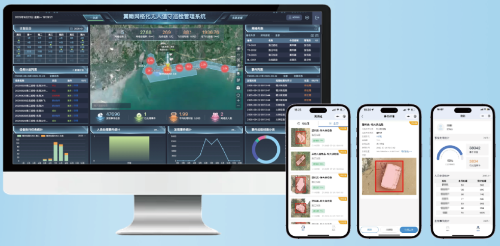 系统分为一图统管系统、事件处理助手移动端、算法模型部署平台组成,包含网格管理、人员管理、排班管理、任务管理、事件管理、AI 识别、数据管理、小程序等核心模块,支持无人机的基础飞行控制、任务规划执行与 AI 识别目标物体,事件处理流程、数据交互功能,适用于各种环境下使用无人机进行巡检的作业场景。本系统通过数字化网格分区、智能任务调度、多源数据融合等功能,推动巡检管理向自动化、精细化、智能化转型,助力行业降本增效与安全管控升级。