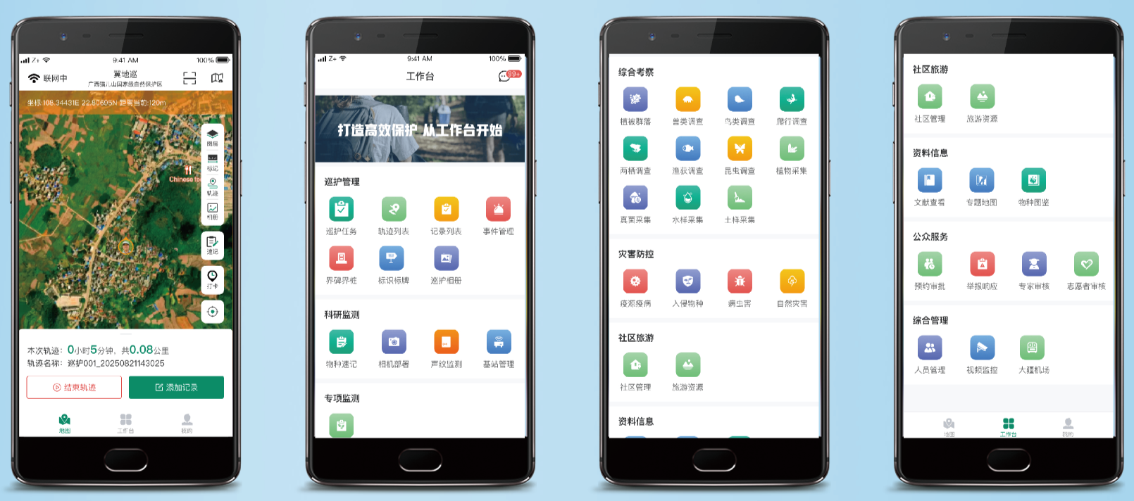 主要功能有在 / 离线地图、轨迹管理、科研监测、专项监测、综合考察、工作台、个人信息数据管理等。能够支持保护区工作人员和承接调查的不同专业调查组同时使用,在野外调查过程中,可以在线或者离线调阅对应保护地已有相关数据资料;可以记录轨迹,并共享野外调查人员位置信息;可以满足同时开展植被、植物、兽类、鸟类、两爬、昆虫、真菌、社区、土样等不同类型的调查,完成调查数据的记录和传输,上传至数据库;野外调查设备的部署与管理。