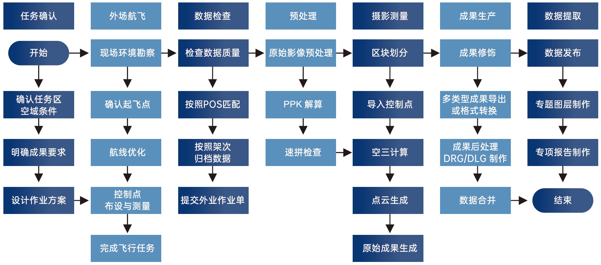 无人机服务的标准制作流程分为外场作业和内业处理。外场作业包括:像控点 + 飞行服务,以提供准确、清晰、完整的航摄数据。内业处理包括影像和模型制作、地物识别和解译、模型叠加效果图件和视频生成。通过标准化的作业流程,翼界科技能够提供完整的、清晰的、可读的无人机服务成果,提交可靠的巡检报告,支撑保护地管理部门管理和决策。